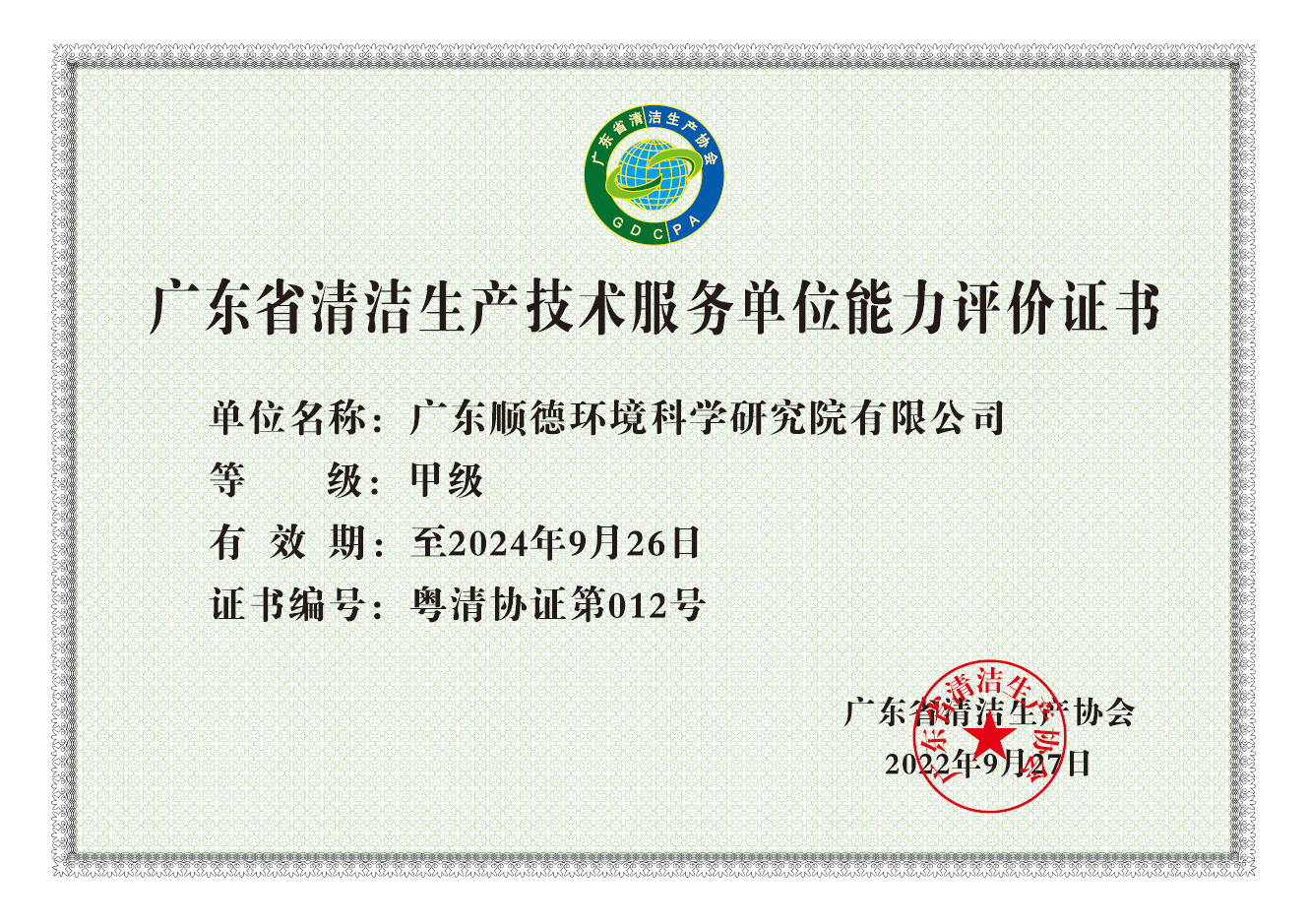 廣東省清潔生產(chǎn)技術(shù)服務(wù)單位能力評價證書